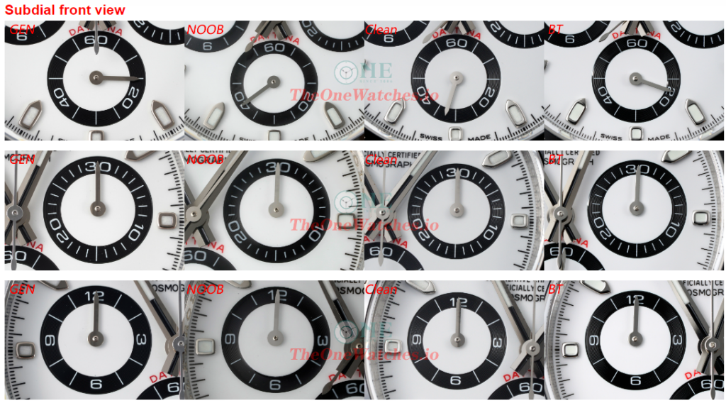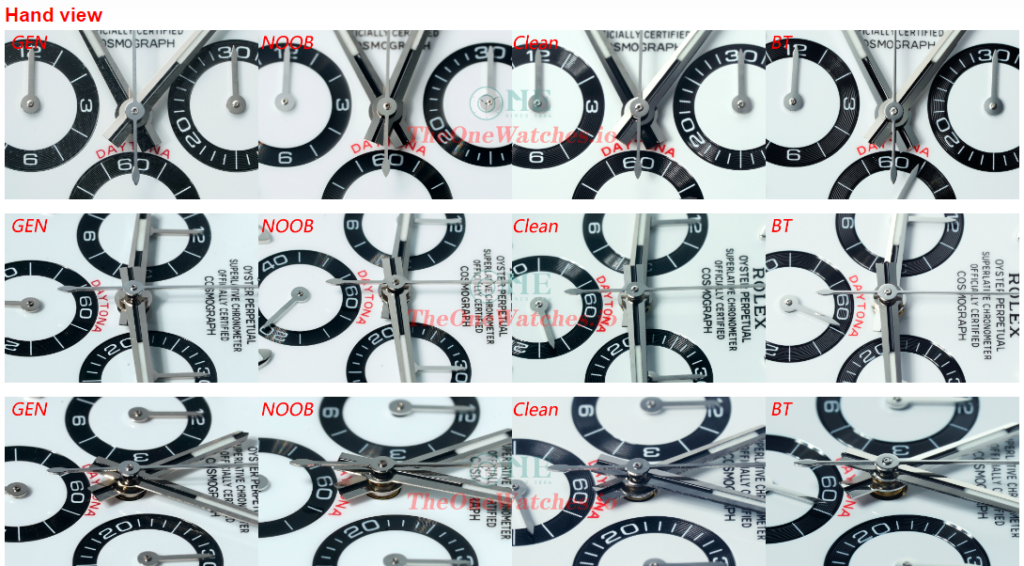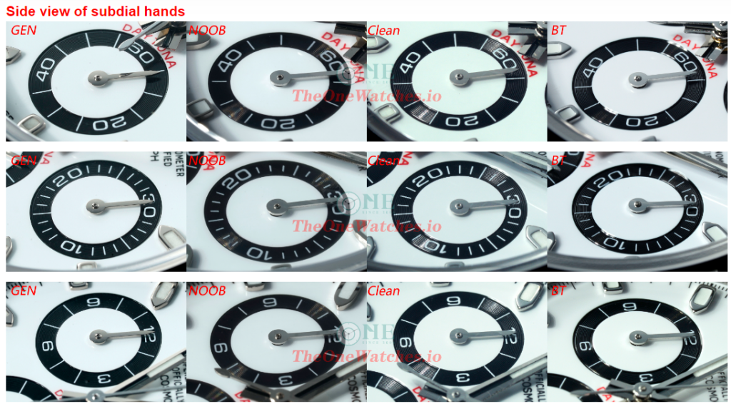 We take chronograph subdial as an example, Noob hands ends is flat (known as scissors hands) due to no independent molding.