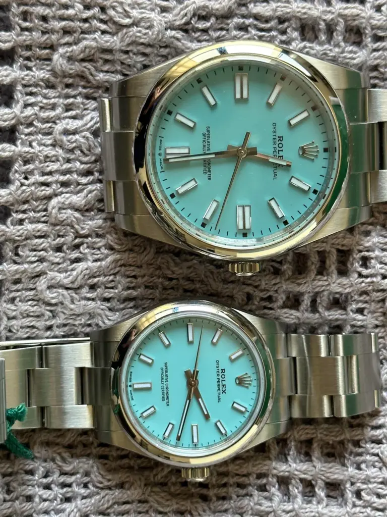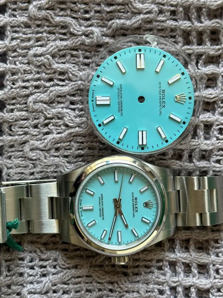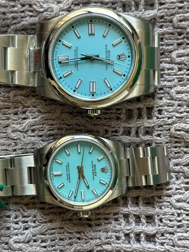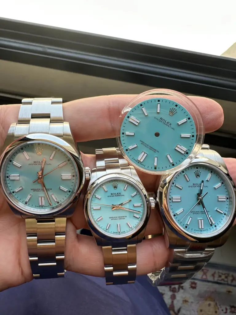 EWF, Gen, Custom, GMF dials Below we see the comparison colour between EWF, Gen, Custom, GMF dials for the Tiffany Oyster Perpetual model. From left to right:1- Custom dial installed in EWF 41mm OP case 2- 31mm GEN OP TIFFANY 3- EWF DIAL ONLY 4 – GMF DIAL (top to bottom) 41mm: Custom dial (in ewf case) 31mm: Gen OP Top: EWF TIFFANY DIAL ONLY BOTTOM: Gen 31 OP Top: GMF TIFFANY OP. 41mm Bottom: Gen 31mm OP. None of them is 100% accurate.EWF and custom dials a little darker GMF is lighter than gen..EWF is definitely better in terms of colour only! Movement is much better in gmf in terms of winding.Let us know what you think and if you want to add more, comment below the post.